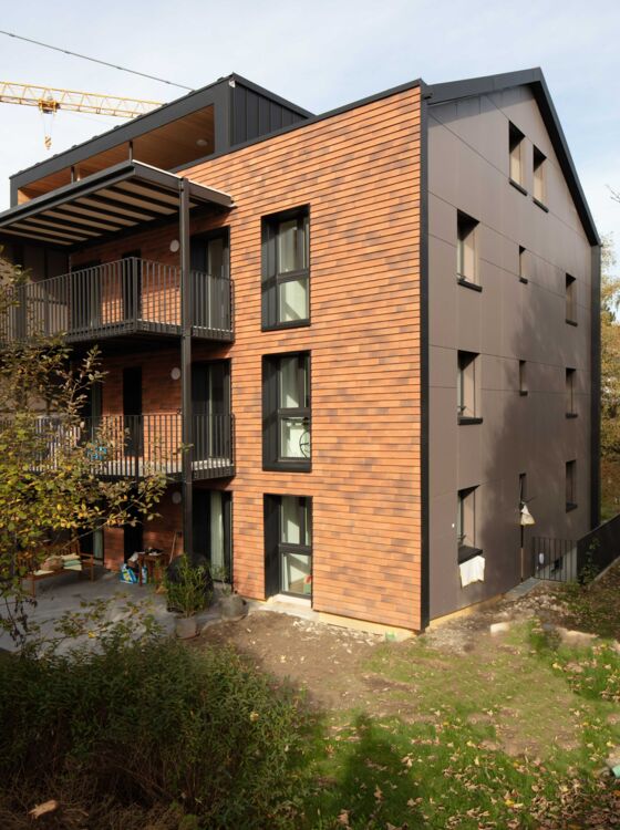 Im Buchsee-Quartier in Köniz werden drei Mehrfamilienhäuser aus den frühen 80er-Jahren in Etappen komplett saniert und ausgebaut. Zusammen mit den neu dazukommenden Dachwohnungen werden letztlich 51 Mietwohnungen entstehen. Grossen Wert legt die Bauherrschaft dabei auf ökologische und energetische Aspekte. Die Häuser erhalten eine zeitgemässe Wärmedämmung und werden mit einer vorgehängten Fassade aus Tonziegeln verkleidet, die an die ehemalige Sichtsteinfassade erinnern. Dabei handelt es sich um den in Laufen hergestellten Fassadenziegel Urban, den die Architekten erstmals am Krøyers Plads in Kopenhagen sahen und dessen Ausdruck sie umgehend überzeugte. Bei der Siedlung Mösliweg wird auch das Dach mit dem Urban eingedeckt, sodass sich die keramische Haut parallel zum First über das gesamte Haus zieht.